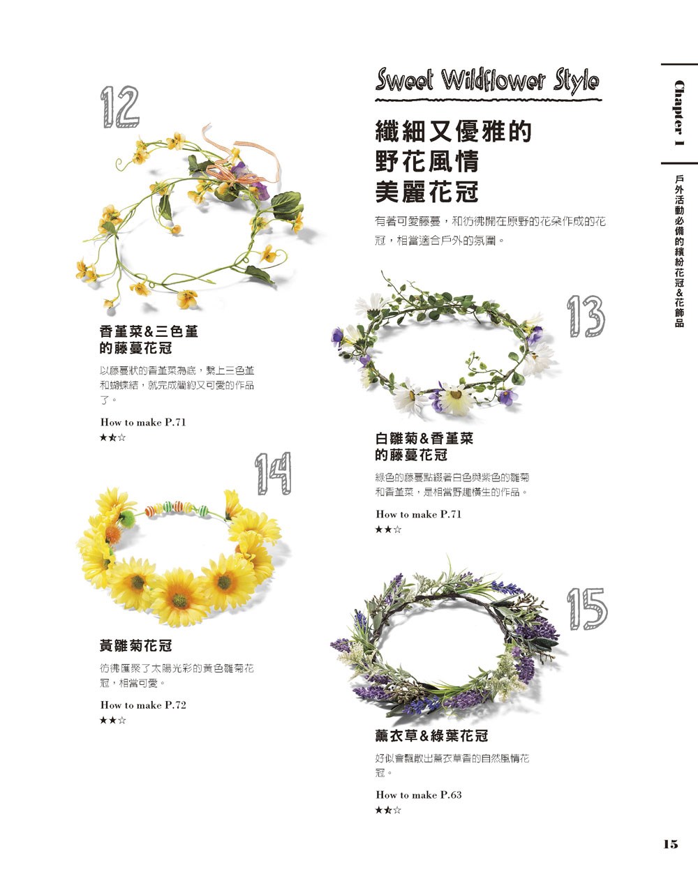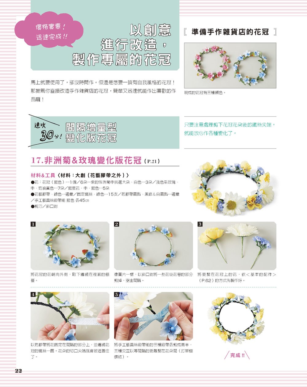 花冠的歷史比捧花更為悠久。現在,花冠跨越了時空,不只是婚禮,在一般的活動也可以配戴,或當成拍照的道具使用。本書以手作商店就可以買到的人造花當成主要素材,只要抓到書中的重點與訣竅,材料不必全照著書上準備也OK。自己親手編織出各種風格的手工花冠與花配飾,享受夢幻又幸福的美好日子吧!