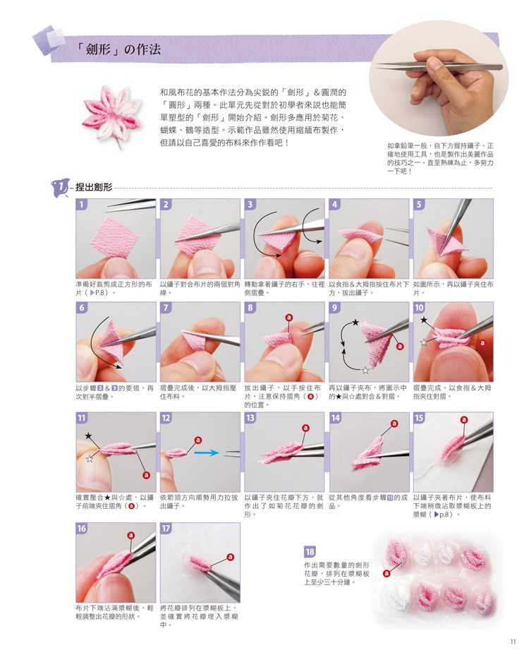 所謂和風布花是屬於日本傳統工藝的一種,它是將裁成正方形的布片摺疊後沾取漿糊貼在底座上,作出花卉&鳥兒等模樣的作品。從前的工匠所使用的是薄正絹材質的羽二重布料,但本書使用的則是比較起來容易取得、製作的正絹縮緬布與綸子&木綿布料等,實際操作時也可依自己喜好自行挑選布料製作。