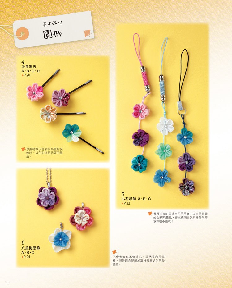 和風布花源於江戶時代,大多用來製作髮插和髮簪等飾品。現在也用來製作藝妓佩戴的髮簪與結婚式、七五三及成人式的髮簪。書中不僅介紹了基本的和風布花製作方法,更介紹了能將和風布花應用在日常生活中的簡單飾品作法。如果你曾驚嘆過和風布花的美麗,不妨也試著為自己製作一件和風布花飾品,創造出充滿自我風格的特色搭配吧!