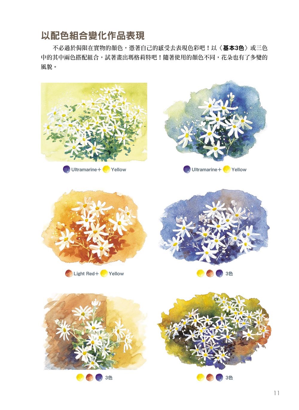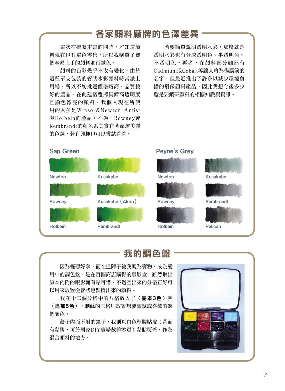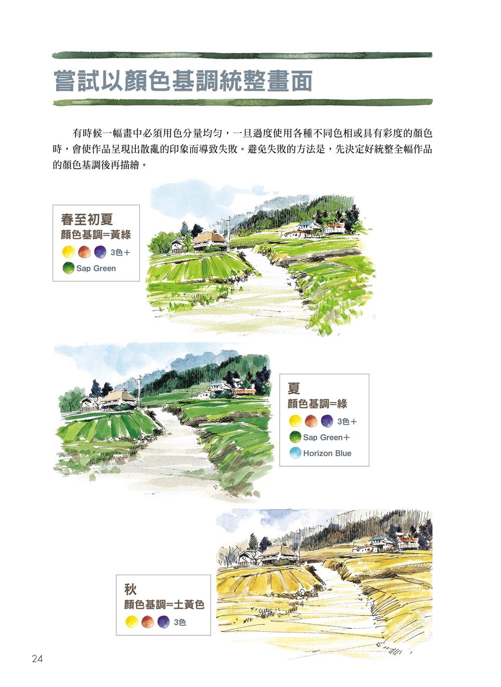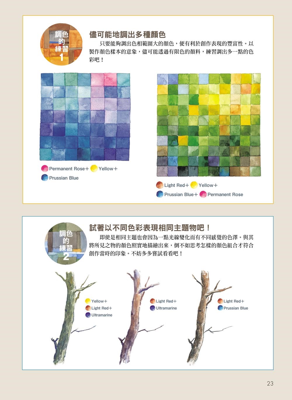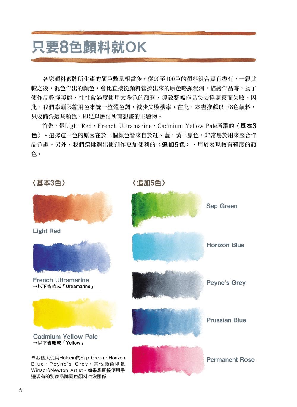 因此,本書提出使用基本的3個顏色(Light Red‧French Ultramarine‧Cadmium Yellow Pale),加上5個顏色(Sap Green‧Horizon Blue‧Peyne's Grey‧Prussian Blue‧Permanent Rose)所調配出的8個顏色來完成畫作。