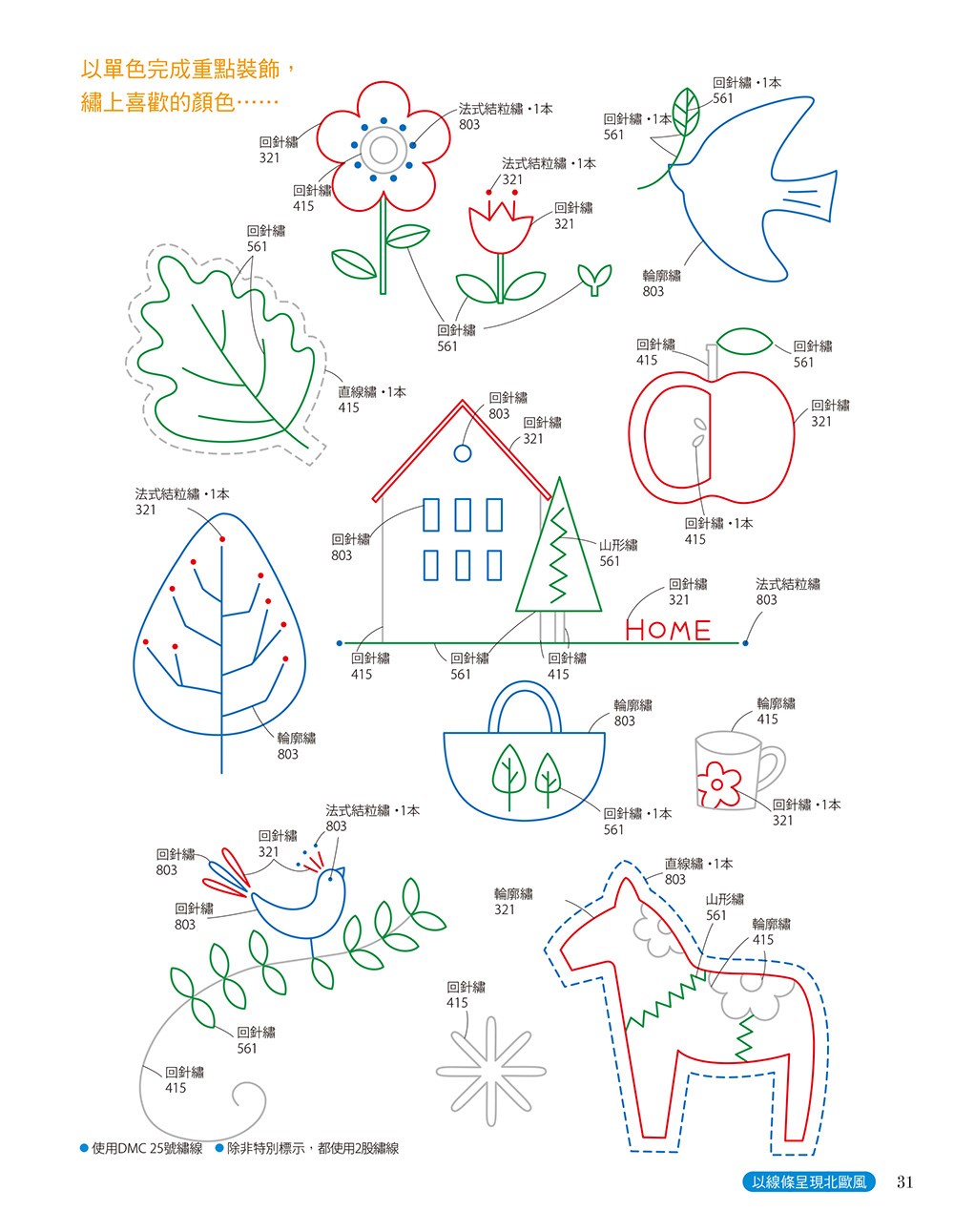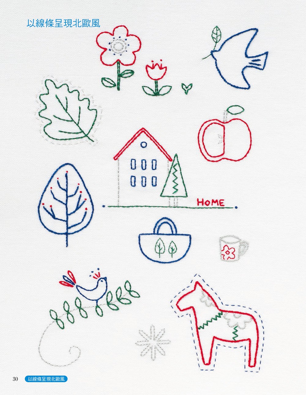 ★從較單純的線條刺繡開始,到進階的填色刺繡,並混用各種針法變化出更多彩多姿的圖案