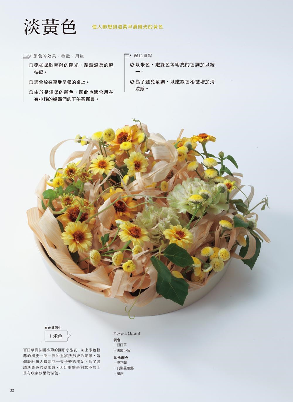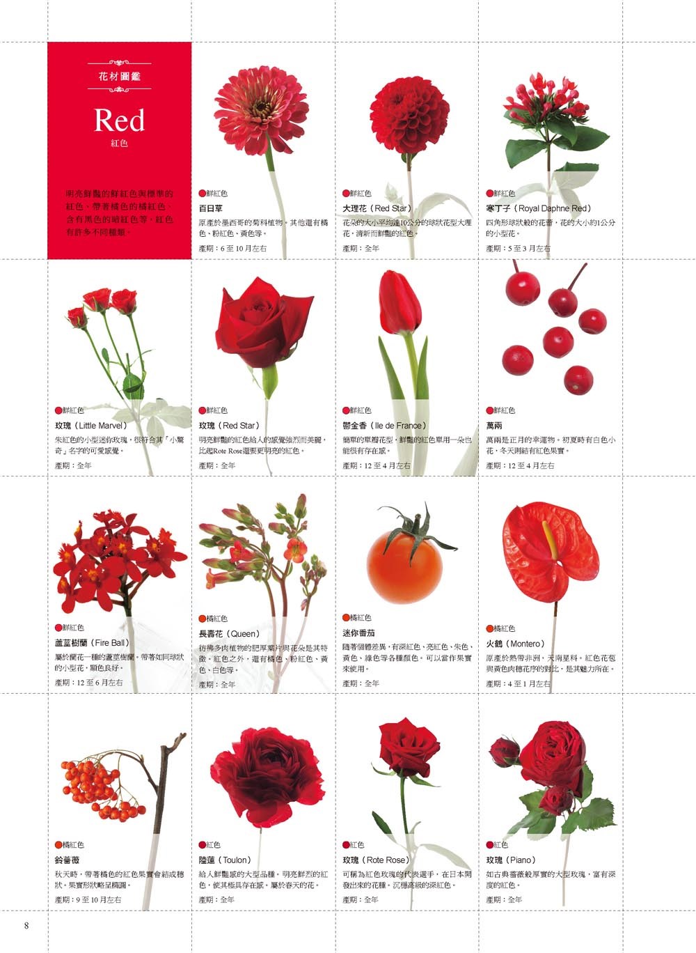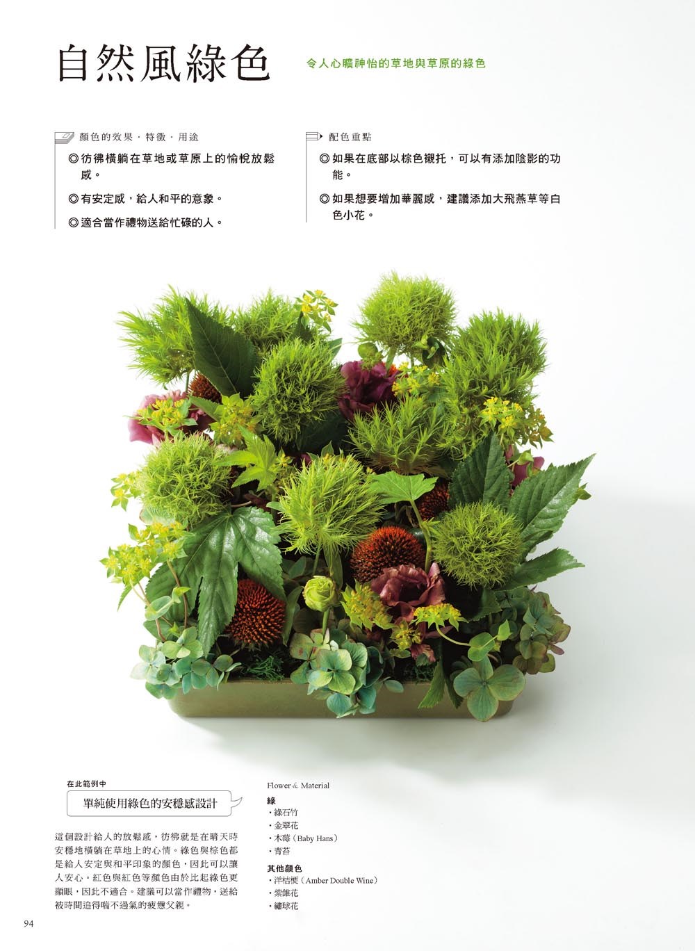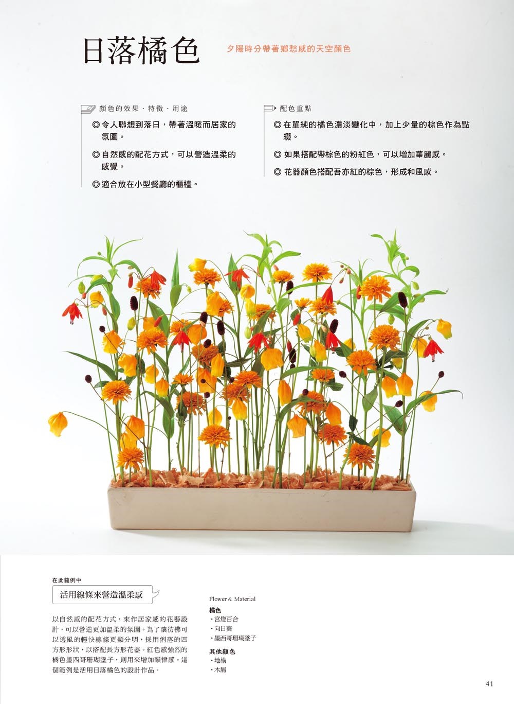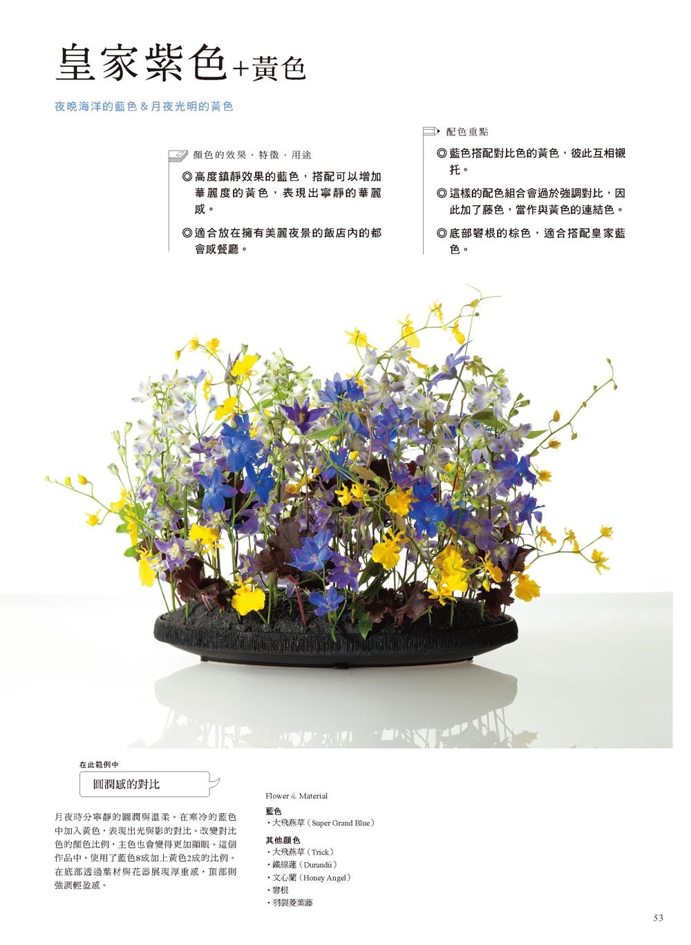 書中將花的色彩分為暖色、冷色、無彩色與中間色等四個主要色系。在身為暖色的紅色花之中,加入一點綠色,成為對比強烈、充滿個性風格的作品;若在紅色中加入一點白色花,便成了充滿和風氣息的年節花!每個顏色也有屬於自己的樣貌與個性,如藍色,讓人聯想到「寂靜」、「真實的愛」、「真實」、「海」、「安寧」、「悲傷」……當想要表達類似主題的作品時,便可善用顏色的關鍵字,來組合出充滿整體感的調性。