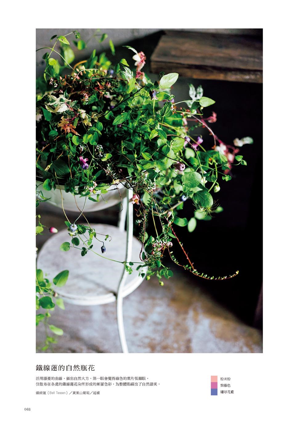 本書精選了許多作者覺得美麗的配色、每個季節如何配色的祕訣等,一一藉由書中的捧花、花圈、造型花藝等130個作品來呈現。可以只是單純欣賞,也可以在下次製作作品時,將它當作食譜般來參考。先瞭解各式各樣的造型,進而探索出自己心中喜歡的風格,每天的花藝生活將會變得更加有趣且精采繽紛吧!
