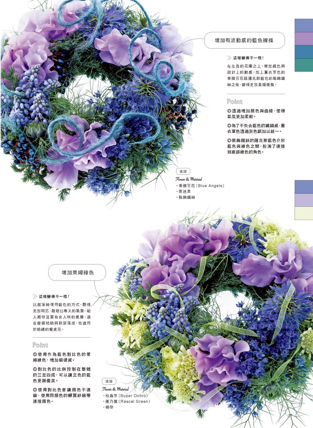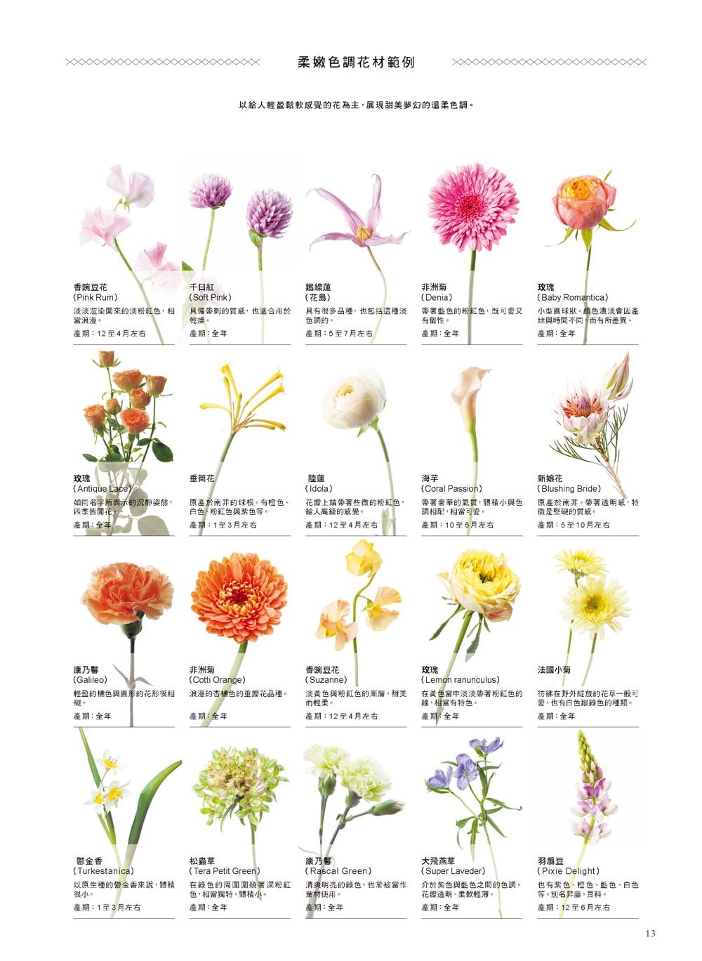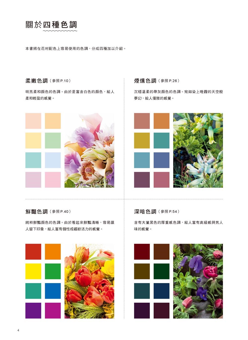 本書介紹花材配色最常也最容易使用的四種色調:柔嫩色調、煙燻色調、鮮艷色調、深暗色調。四種截然不同的顏色組合,適合搭配不同的場合,或贈送給不同年齡性別的人。