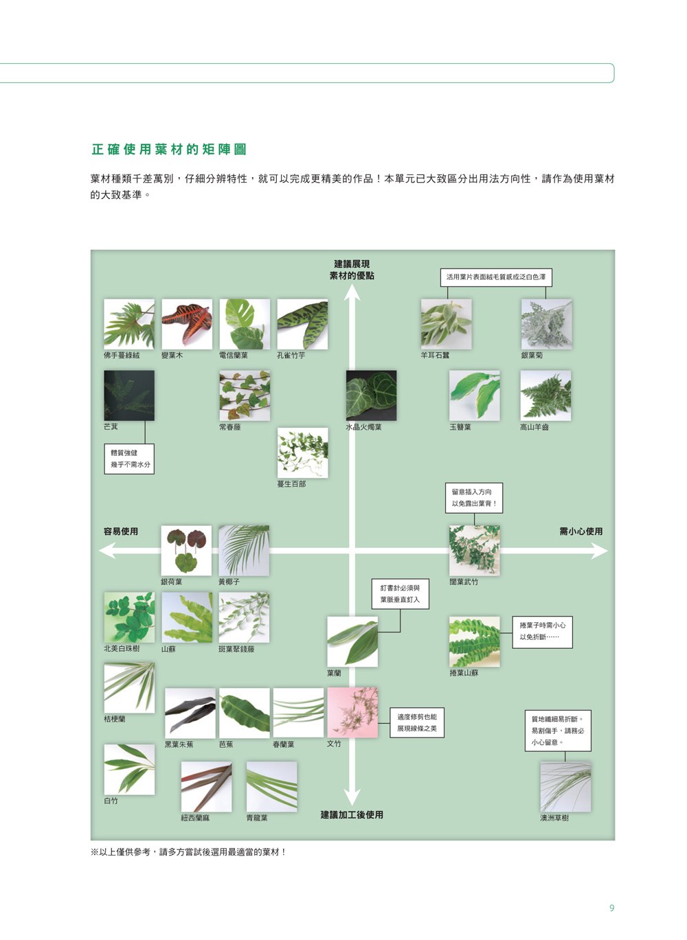 本書依據葉材外觀,分成「展現線條」、「展現葉面」、「展現色澤&質感」三種類型。將各種葉材依照形狀與質感分類,讓愛花人可以更深入了解葉材。系統化的分類,在實際插作時,也可以更快了解適合採用的方法與表現方式。