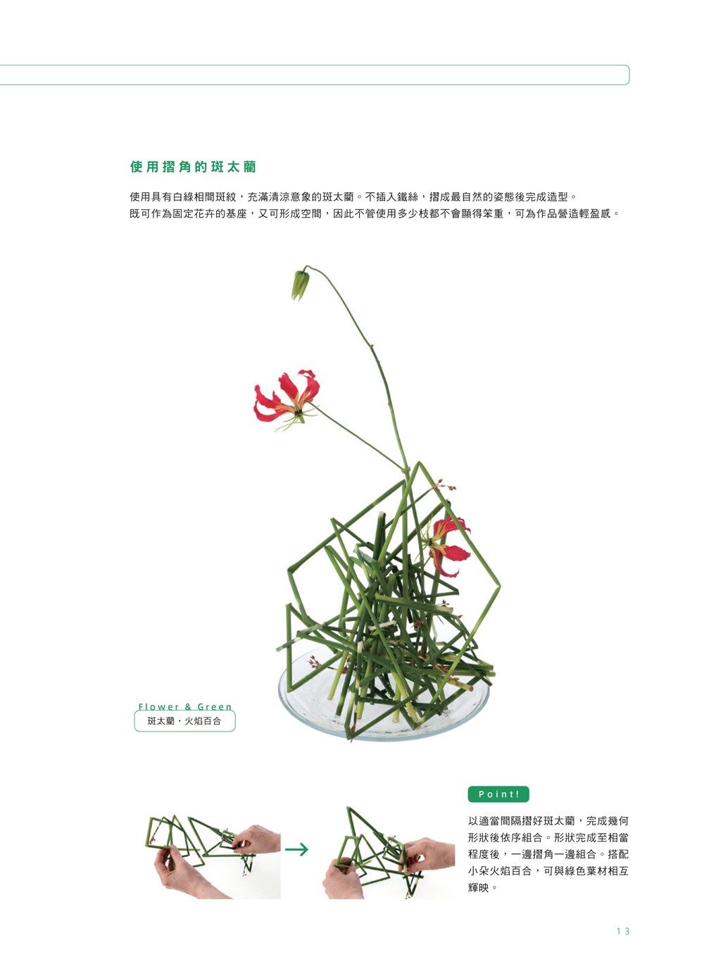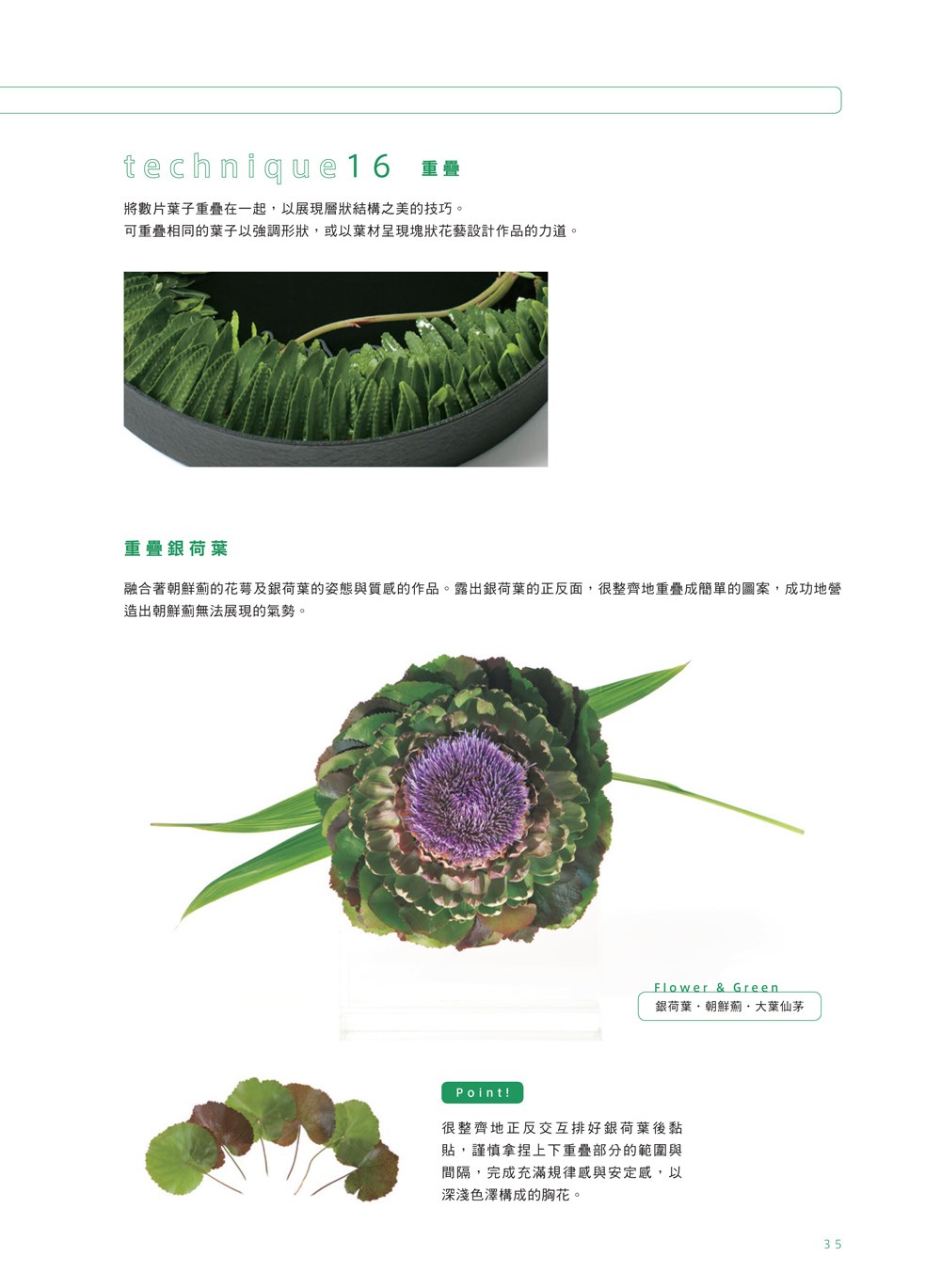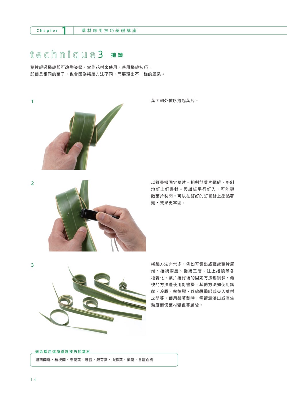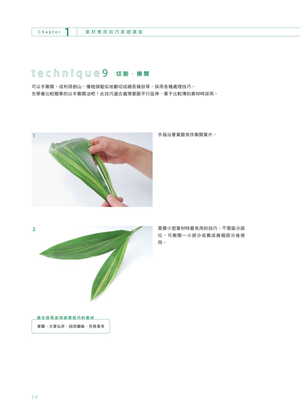 透過19種葉材變形的技巧,如:彎曲、摺角、捲繞、編織、修飾、使用鐵絲、切割……讓葉材的運用方法不只是單純插上,而多了更多型態運用上的變化巧思。在熟悉各種樣貌的葉子的使用技巧之後,書中也有應用篇,讓花藝玩家的視野更加寬廣多元。現在就來一起試試看葉子的有趣玩法吧!