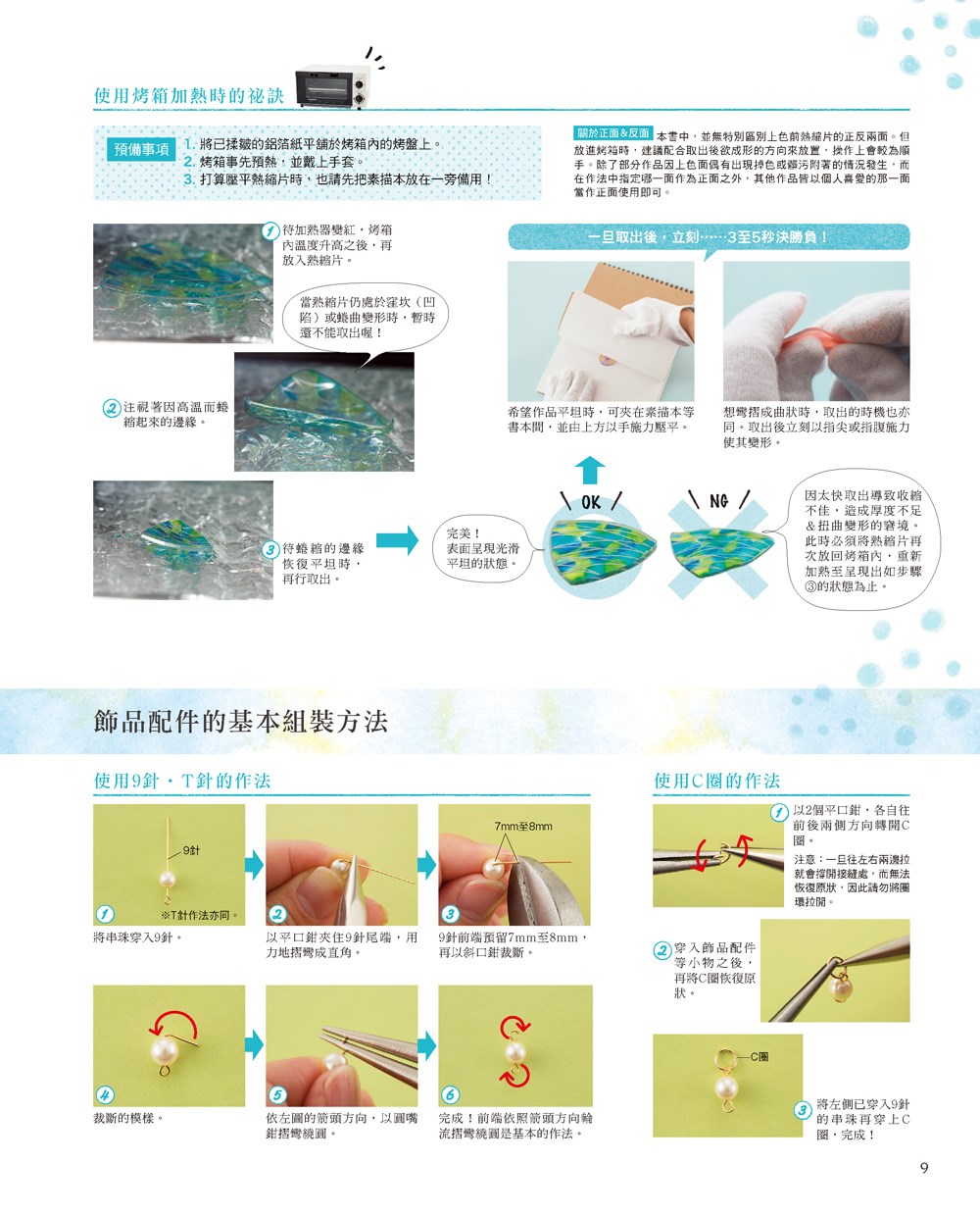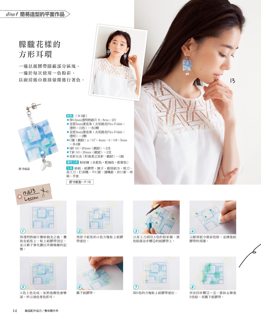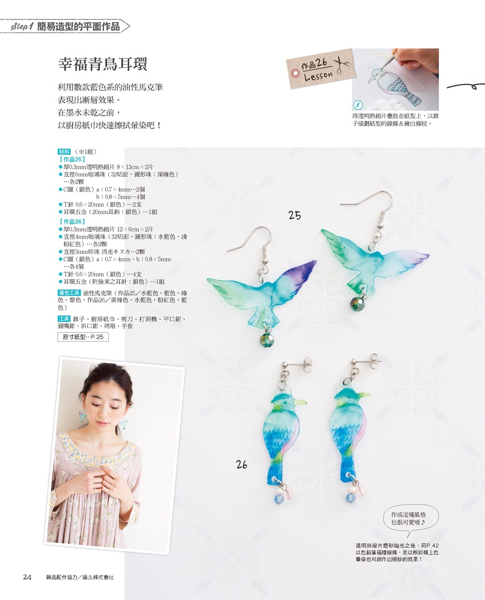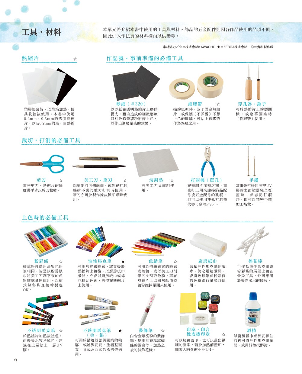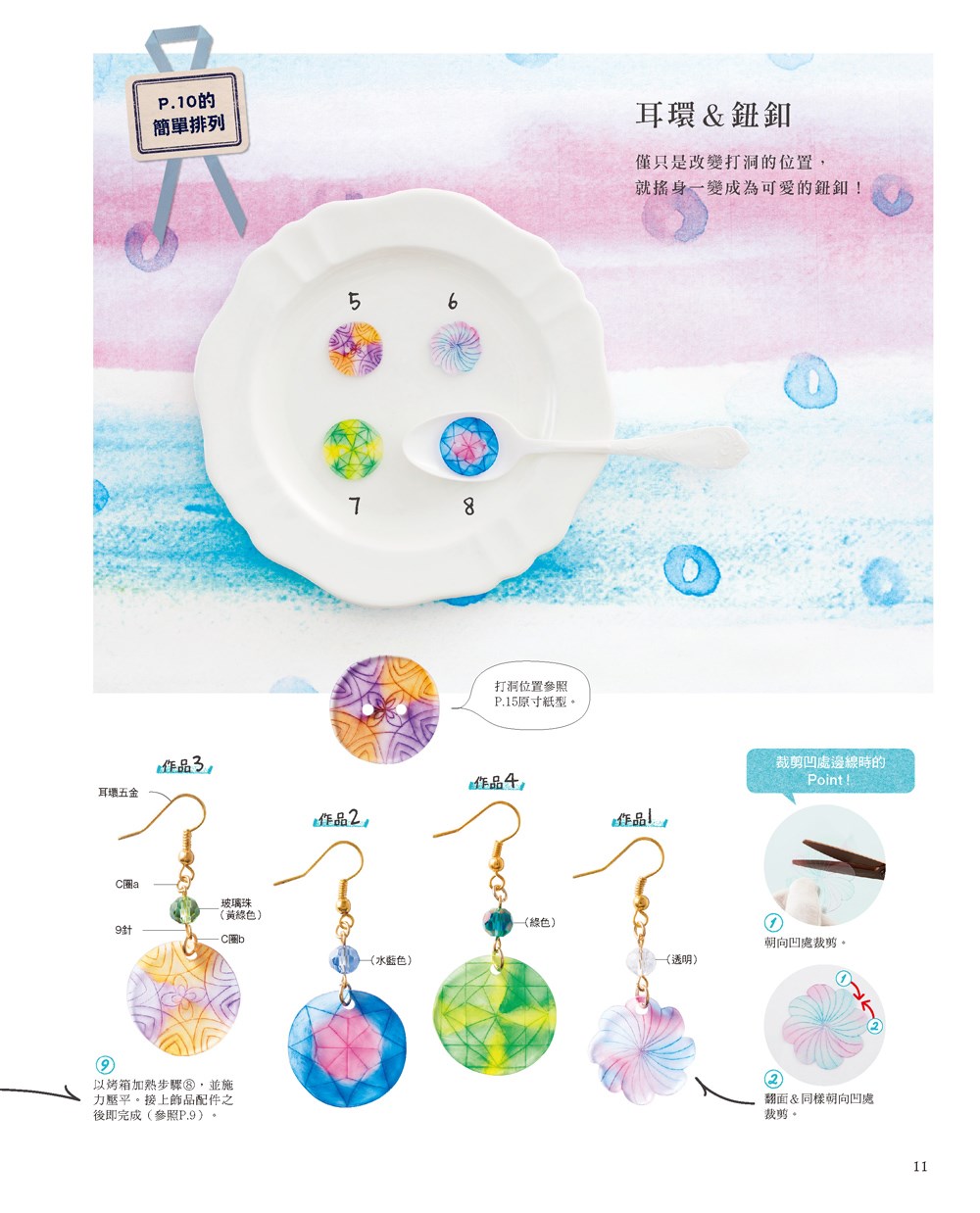 熱縮片作品晶透的質感相當適合作為夏天的主題配件。將精心製作的作品加上飾品五金,不論是單件作品的加工,或多件作品的組合,書中皆有完整製作圖解。若再塗上一層UV膠,更能保護顏色塗層&營造出更加晶瑩透亮的質感。