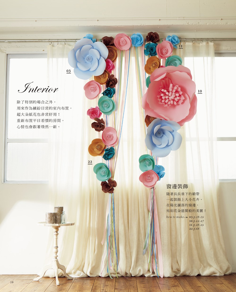而且製作方法可是相當地簡單喔!只要掌握將花瓣一片一片地分開貼合&將紙張蛇腹摺的兩大基本作法,再進行搭配組合&變化,就能完成各式各樣的超大朵紙花。你也試著作作看簡單好製作&效果一級棒的超大朵紙花吧!