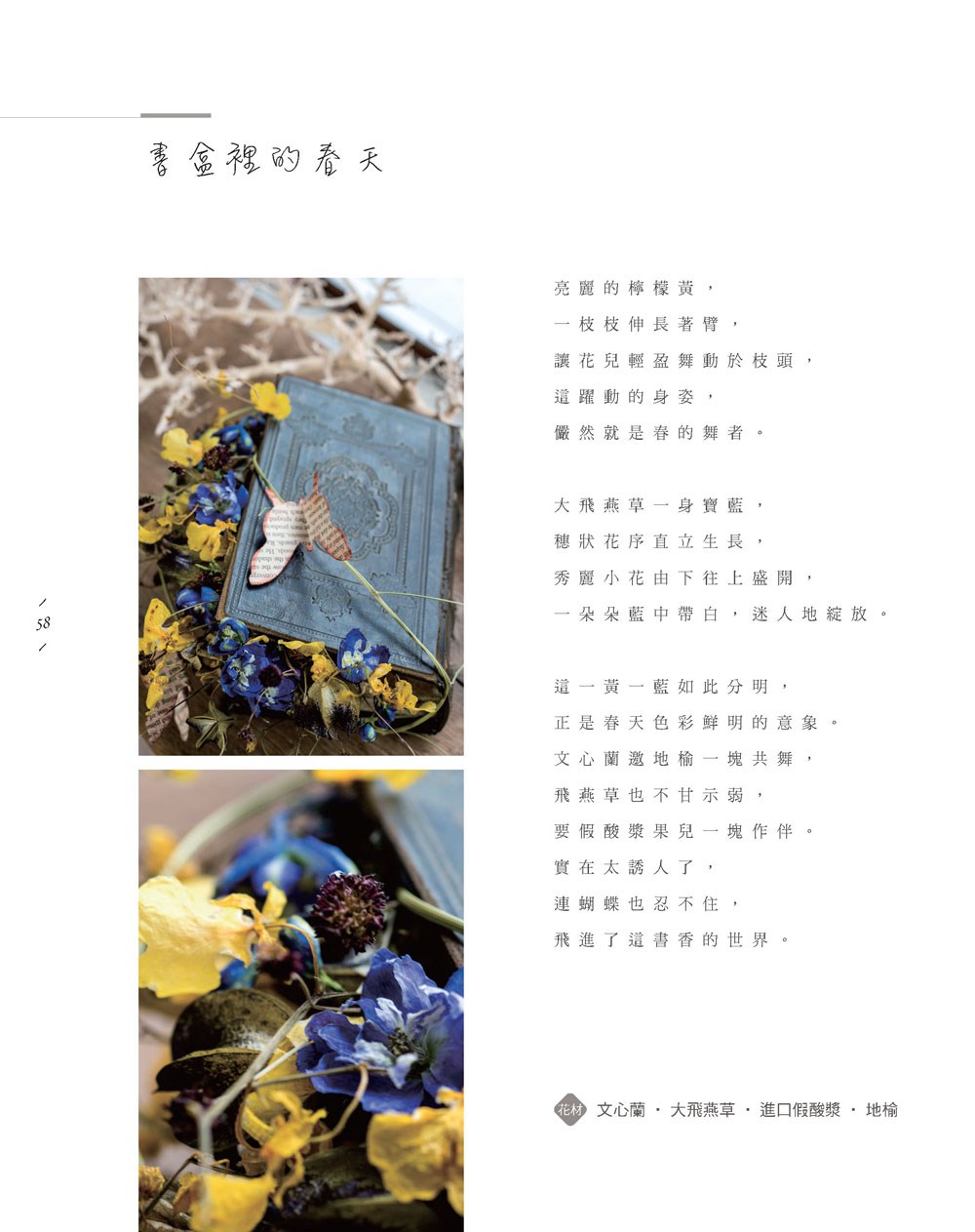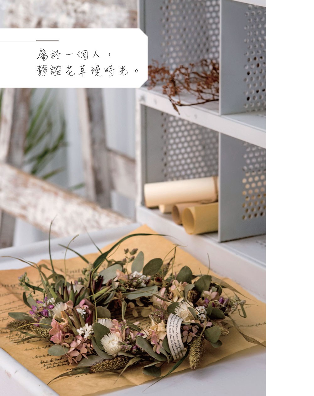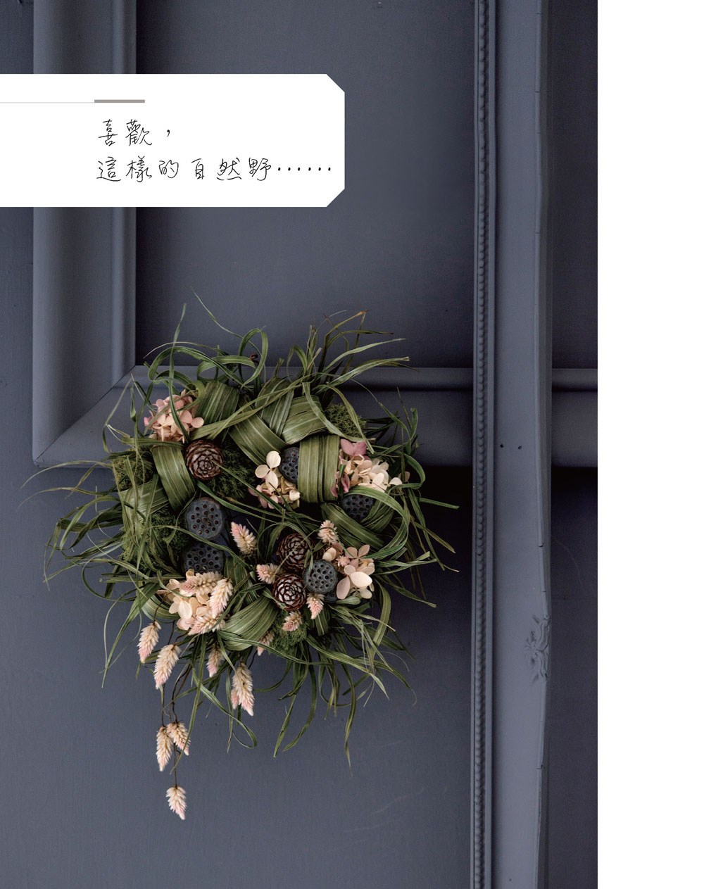 不用刻意地追尋,僅僅單純的凝視、撫觸、欣賞,安靜的與花草對話,靜靜地徜徉在大自然所帶來的驚奇與美好之間。慢慢地構思,慢慢地收集,各式各樣的花葉與果實,乾燥後的樸實質感,恣意的野性姿態,成就了生活中的小小樂趣。