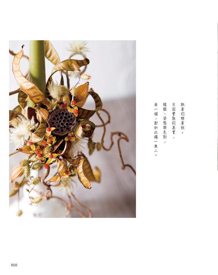 挑戰了更多以往認為不能乾燥的素材、或是少見的獨特植物,可能以另一種角度去觀賞它們、或是以新的乾燥手法去保存它們。每一種花草,帶著時間所淬煉出來的姿態;獨特的韻味,除了單純欣賞,也能結合彼此的特性,作出與眾不同的乾燥花藝。