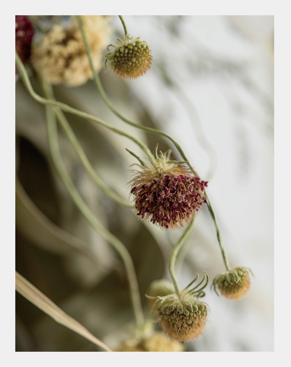 Kristen持續挑戰了許多不能乾燥的素材和少見的獨特植物,不僅以不同角度觀賞它們,更以新乾燥手法保存花草的美麗。對她而言,每一種花草都帶著經時間淬煉而出特有姿態與韻味,因此,經不斷研究之下,Kristen以創意結合花草彼此的特性而創作出與眾不同的乾燥花藝作品。