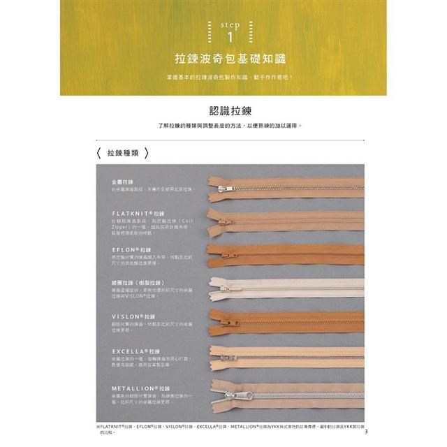 自基礎的拉鍊介紹、認識拉鍊、挑選拉鍊開始,配合拉鍊製作紙型,依照想要位置、款式、設計,可運用本書的製版教學,自行設計紙型,製作出想要的拉鍊包,即使是初學者製作也沒問題!本書附錄紙型貼心加上了製圖用的方格紙,讓想要自學繪製基本版型設計的初學者也能快速上手,縫合拉鍊並難事,跟著越膳夕香老師的講解及詳細教學,自由自在地運用本書技法作出各式各樣的拉鍊包,享受手作人的設計樂趣吧!