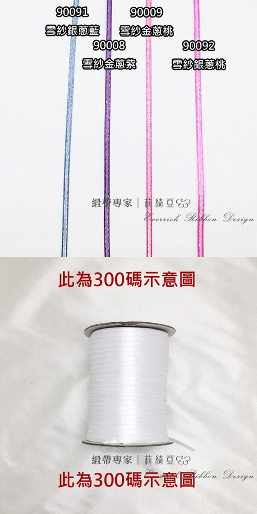 【商品規格】 ► 尺寸:1分3mm(±2mm),300碼/捲(1碼=90cm) ► 材質:雪紗金蔥 【注意事項】 ► 每台電腦螢幕會有些許色差,顏色以實品為主,無法接受色差的朋友,請考慮後再購買。 ► 請確認選購商品為正確,訂購完成後將無法更改訂單內容、數量及付款方式!若欲修改訂單,需取消原訂單,再重新訂購。 ► 請以網路訂購方式為主,恕不接受電話訂購。