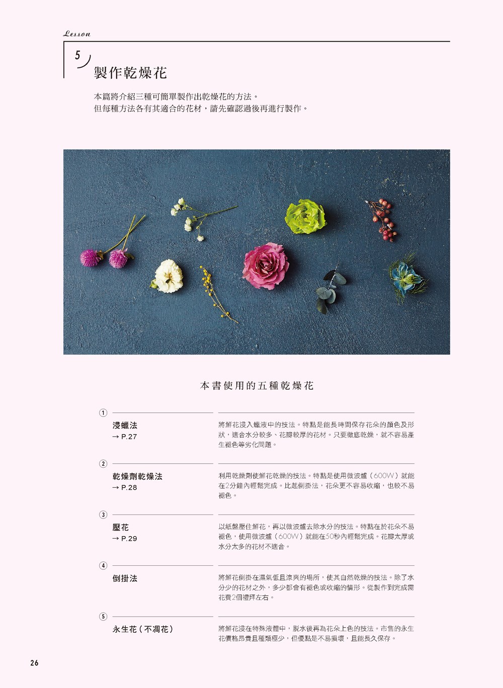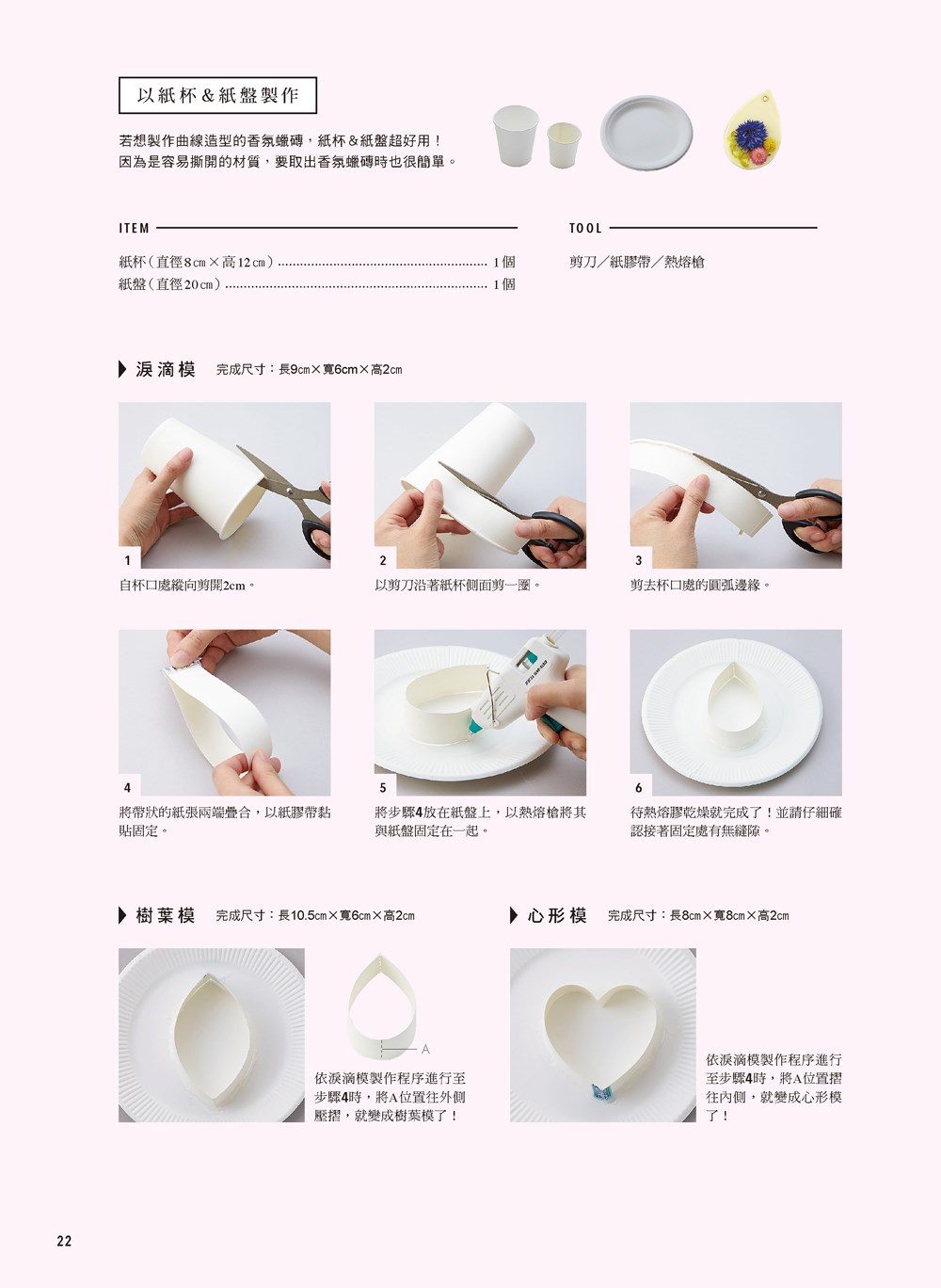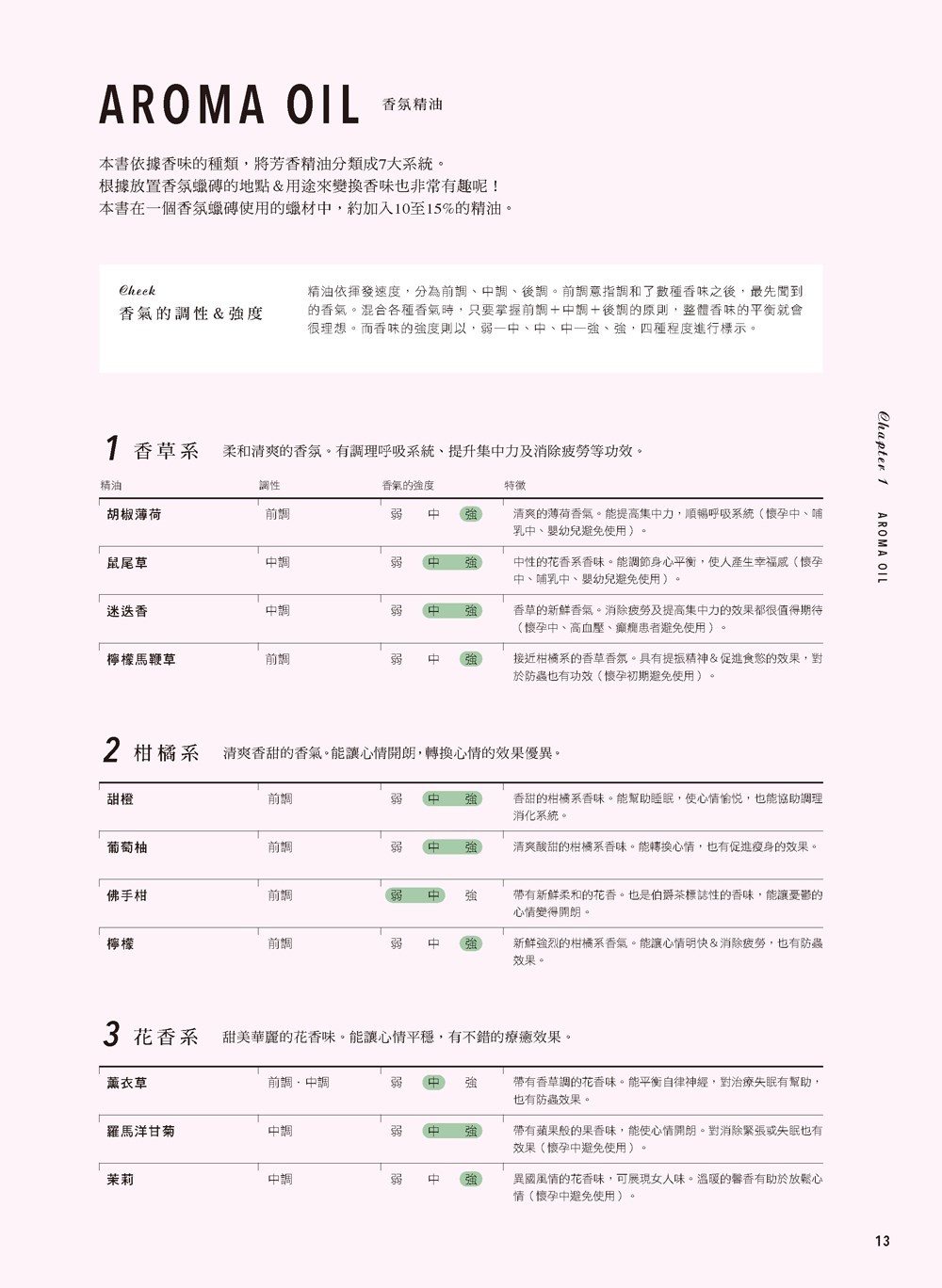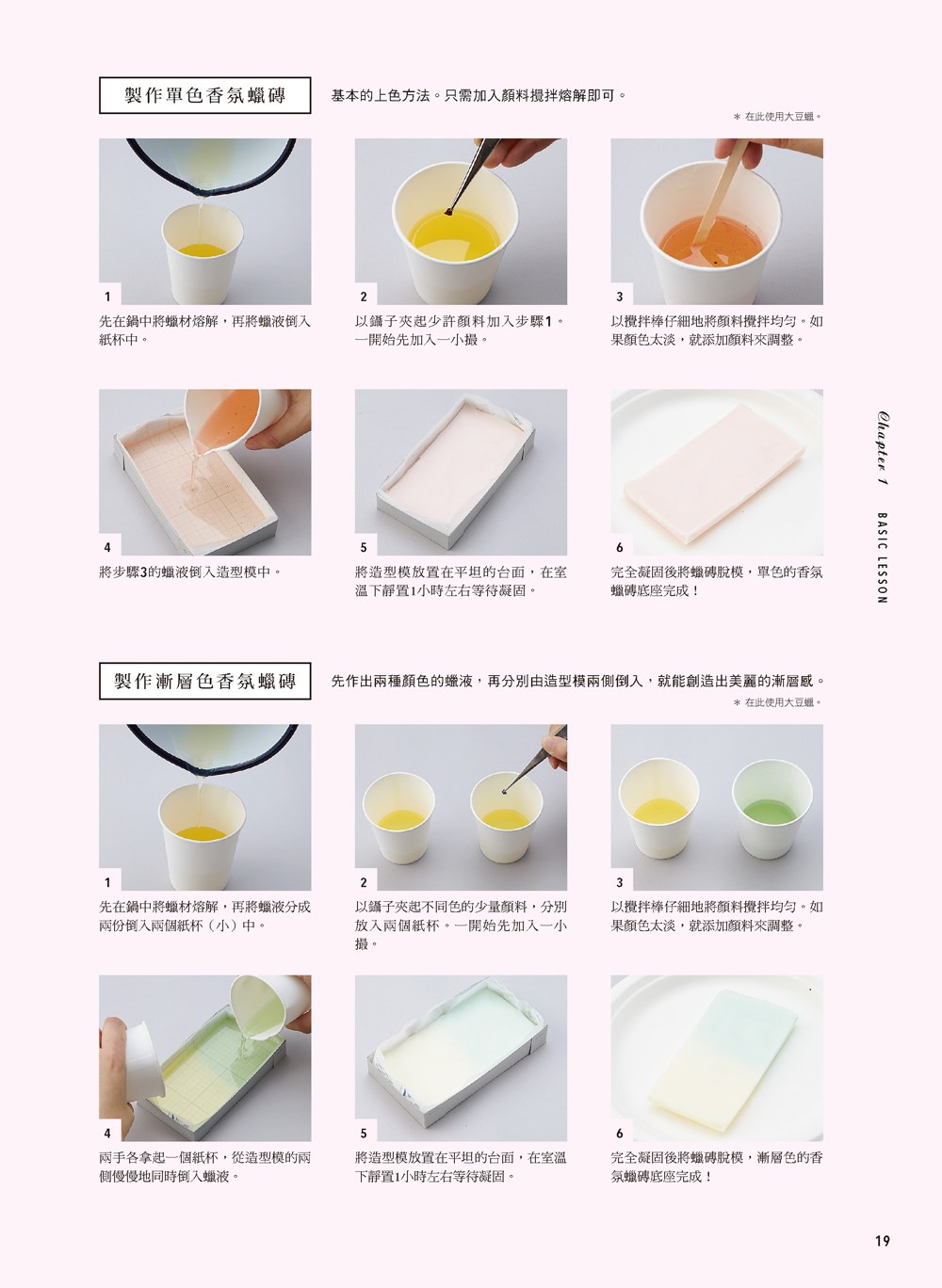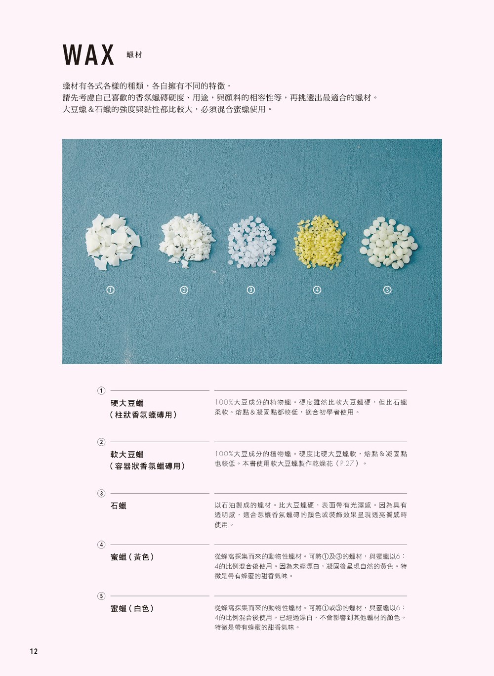 除了基本的蠟磚製作流程,本書更針對各項細節技巧,如造型模的製作、自製乾燥花、自製裝飾小物、蠟磚上色、精油介紹……等進行詳細的解說,並淺顯易懂地以畫面構圖技巧教你如何成功地配置出美麗如專家級的花草香氛蠟磚。不論是作為家中的點綴裝飾,或送給重要之人的禮物,都將帶來視覺×嗅覺的雙重享受&驚喜。